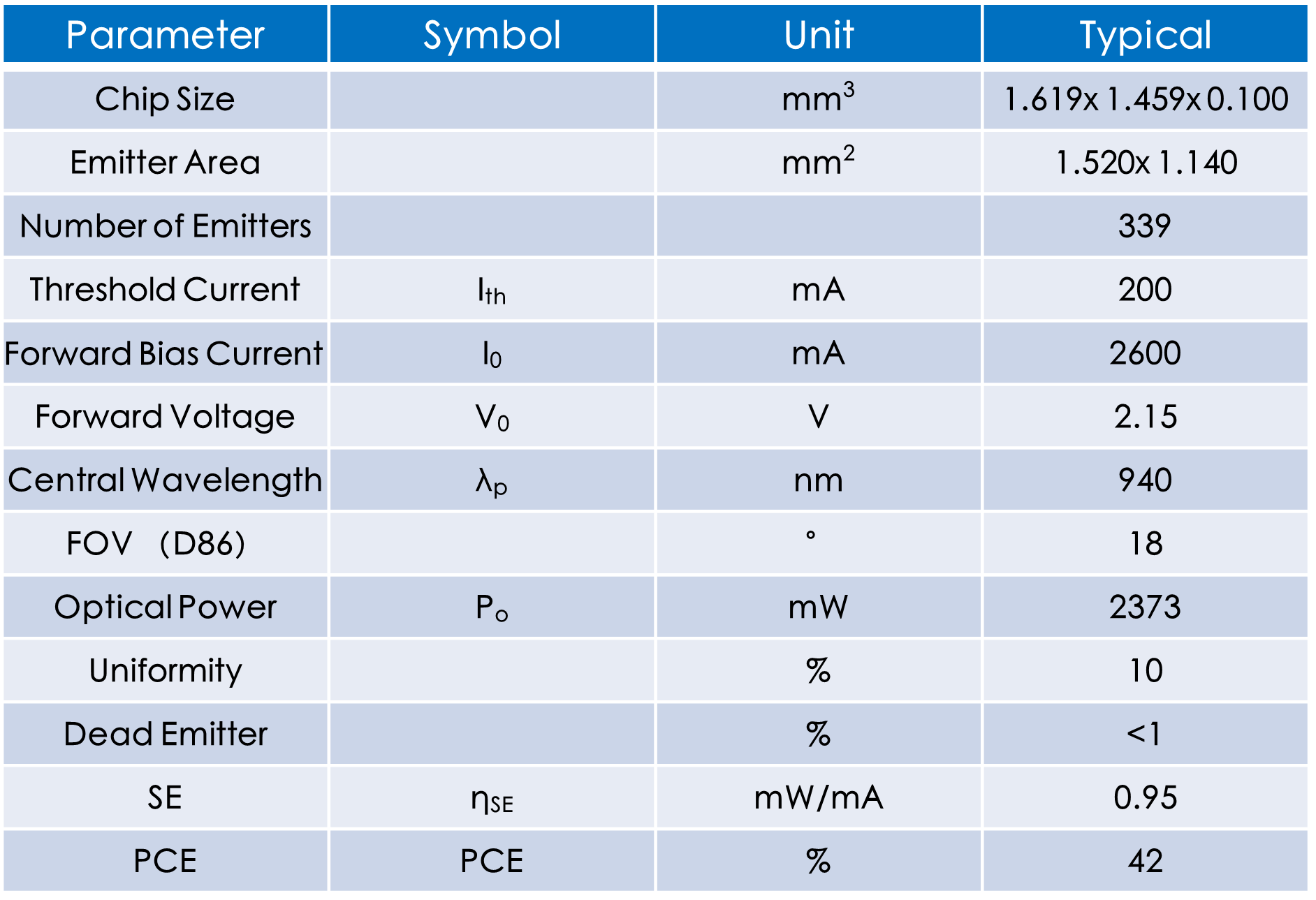 規則陣列940nm VCSEL 功率:2.3W PCE:42%