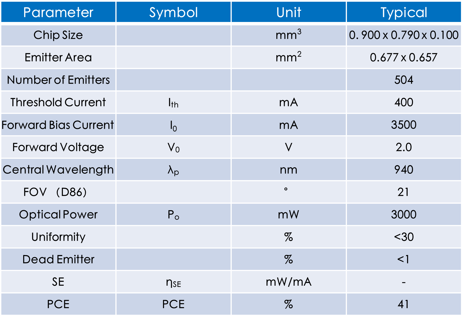 規則陣列940nm VCSEL(單邊打線) 功率:3W PCE:41%