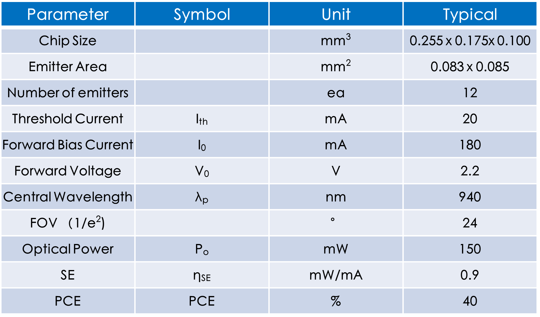 多點940nm VCSEL 直流功率:150mW 發散角:24°
