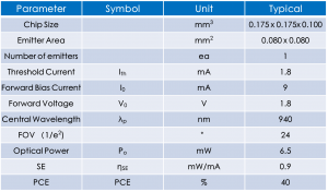 Single point 940nm VCSEL DC power: 6.5mW Divergence angle: 40°
